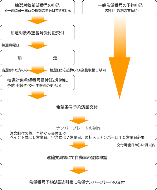 - 希望番号予約済証に記載の自動車登録番号標交付可能日以降の有効期間内(交付可能日から1ヶ月以内)に運輸支局で登録申請を行い、登録後、希望ナンバープレートの交付をお受け下さい。(有効期間を経過している場合は、希望番号での登録申請及び希望ナンバープレートの交付はできませんのでご注意下さい。)